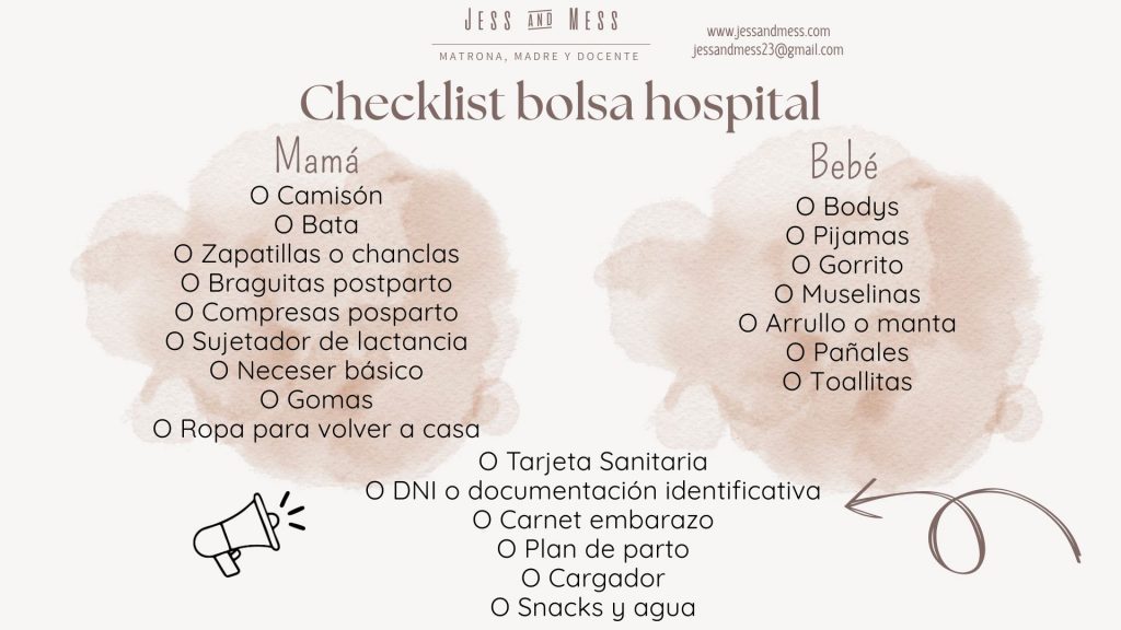Aunque cada hospital puede tener pequeñas diferencias, la mayoría de familias usan una lista bastante similar. Pregunta antes en tu hospital ya que algunos incluyen compresas o incluso pañales y otros en cambio, no.